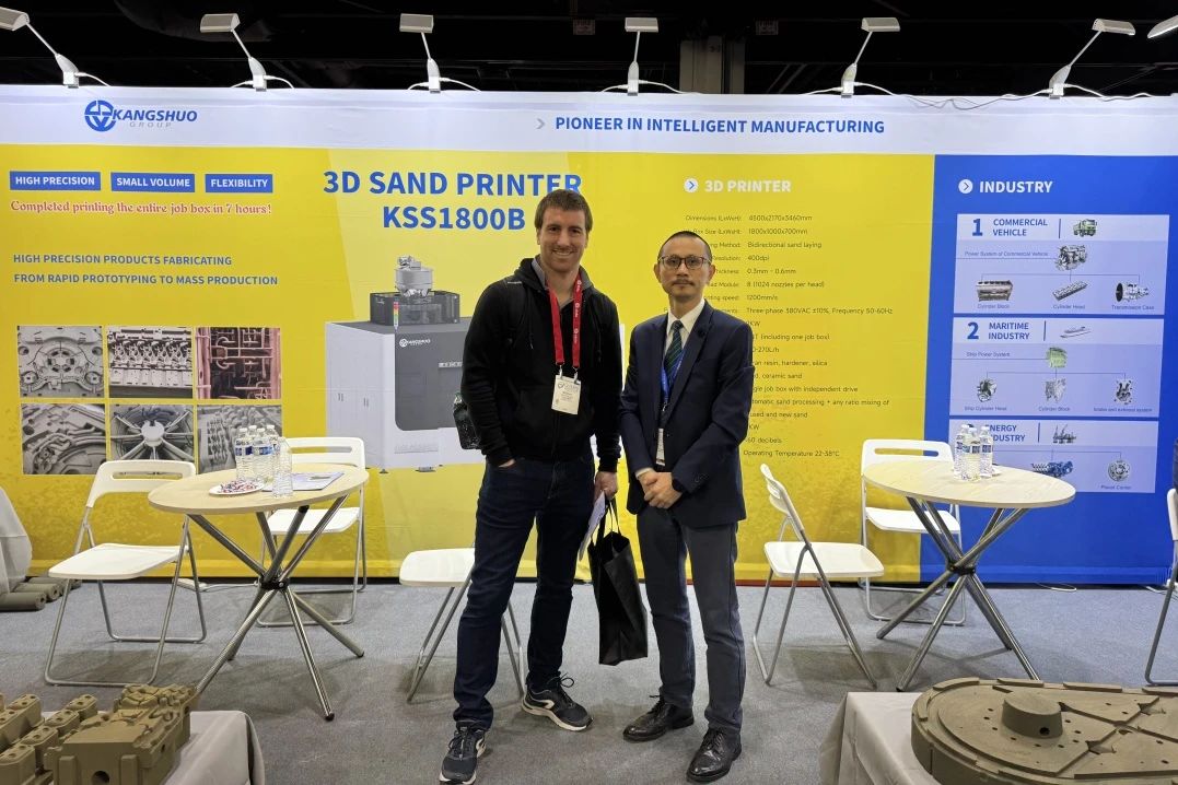 在展會現(xiàn)場,康碩集團的KSS1800B砂型3D打印機備受關(guān)注??蛻魧ζ涓咝Т蛴∧芰o予高度評價,設(shè)備最高打印效率達270L/h,速度可達1200mm/s,7小時以內(nèi)即完成整箱打印,遠超行業(yè)平均水平;其CT7級鑄造精度和0.3mm層厚控制能力,顯著縮短復(fù)雜零部件的生產(chǎn)周期,吸引了來自全球各國領(lǐng)域客戶的重點關(guān)注。