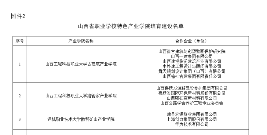 2023年9月25日,省教育廳、省人社廳、省發(fā)展改革委等7部門聯(lián)合發(fā)布通知,公布了定襄法蘭產(chǎn)業(yè)學(xué)院等30個山西省職業(yè)學(xué)校特色產(chǎn)業(yè)學(xué)院培育建設(shè)名單。按照《中共山西省委辦公廳 山西省人民政府辦公廳印發(fā)<關(guān)于推動現(xiàn)代職業(yè)教育高質(zhì)量發(fā)展的實(shí)施意見>的通知》(晉辦發(fā)[2023]3 號)和《山西省教育廳等七部門關(guān)于印發(fā)<山西省職業(yè)學(xué)校特色產(chǎn)業(yè)學(xué)院建設(shè)工作方案>的通知》( 晉教職成[2022]11號)要求,經(jīng)學(xué)校申報、資格審核、專家評議,康碩(山西)智能制造有限公司、晉城富士康智能制造職業(yè)培訓(xùn)學(xué)校有限公司、山西宏安翔科技股份有限公司聯(lián)合申請的“晉城技師學(xué)院智能制造產(chǎn)業(yè)學(xué)院”被列入了“山西省職業(yè)學(xué)校特色產(chǎn)業(yè)學(xué)院培育建設(shè)名單”: