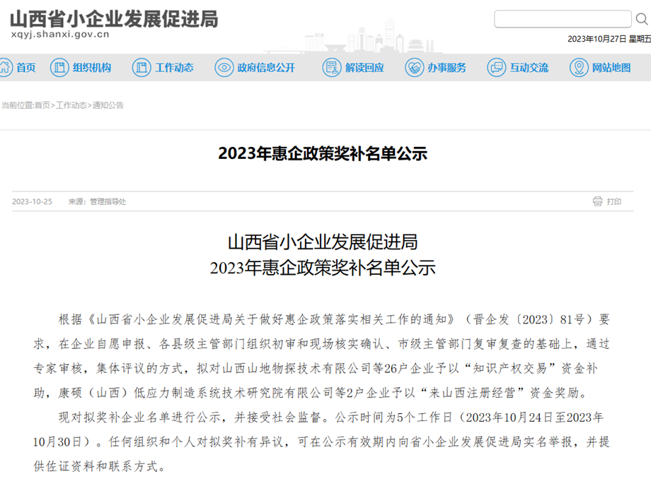 近日,山西省小企業(yè)發(fā)展促進局對2023年惠企政策獎補名單進行了公示。其中,擬對我司“康碩(山西)低應力制造系統(tǒng)技術研究院有限公司”予以“來山西注冊經(jīng)營”資金獎勵。