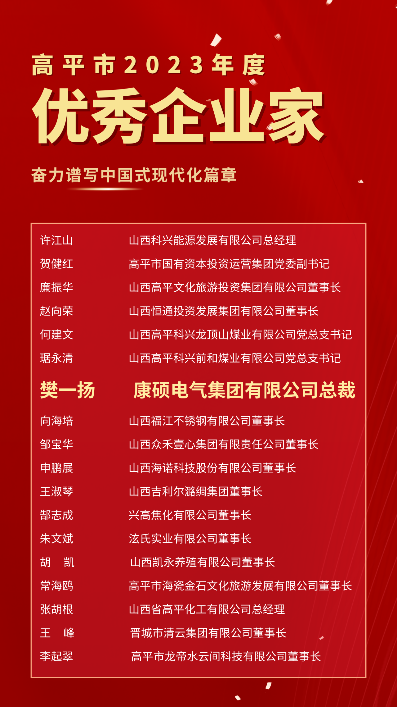 為褒揚(yáng)先進(jìn)典型、樹立榜樣力量、激勵(lì)干事創(chuàng)業(yè),高平市委市政府決定:對(duì)2023年度各行各業(yè)、各條戰(zhàn)線上涌現(xiàn)出來的勞動(dòng)模范予以表彰獎(jiǎng)勵(lì)。2024年2月26日,全市三級(jí)干部暨勞模表彰大會(huì)在高平市委黨校報(bào)告廳召開,康碩集團(tuán)總裁樊一揚(yáng)榮獲高平市2023年度“優(yōu)秀企業(yè)家”稱號(hào)!