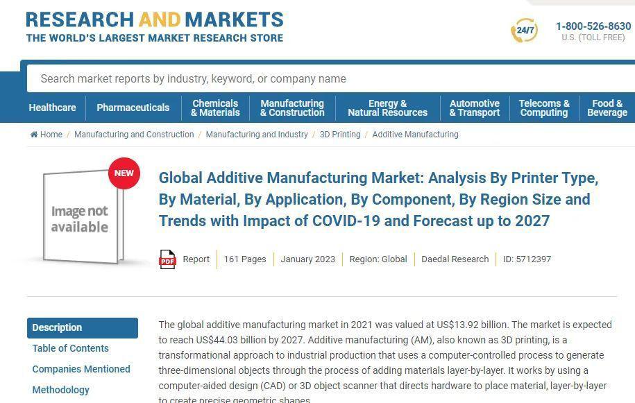 Research and Markets于2023年初發(fā)布了一份關(guān)于全球3D打印市場(chǎng)的最新研究報(bào)告。該公司估計(jì),到2027年,3D打印行業(yè)的價(jià)值將從今年的168.3億美元(約1137億人民幣)增長(zhǎng)到440.3億美元(約2975億人民幣),即2021年至2027年的年增長(zhǎng)率為21%。