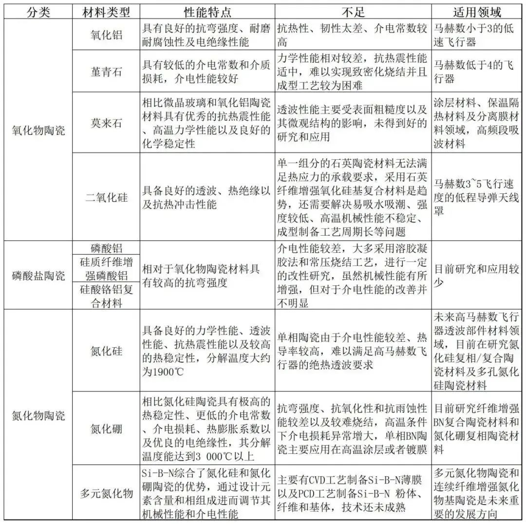 ▲不同種類透波陶瓷的特點及適用領域