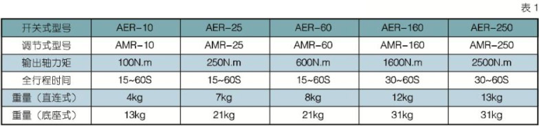 1 AMR/AER 系列90°角行程電動(dòng)執(zhí)行機(jī)構(gòu)型號(hào)規(guī)格及重量(見表1)