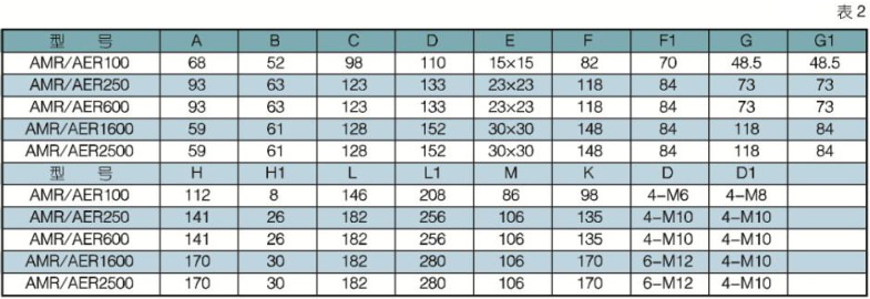 2 AMR/AER 系列角行執(zhí)行機(jī)構(gòu)(直連式)外形(見圖1)及安裝尺寸(見表2)